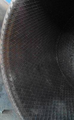 焊接的鋼網(wǎng)龜甲使鋼罐和聚乙烯完美的融合在一起,不脫落。襯塑厚度可達16mm以上。
